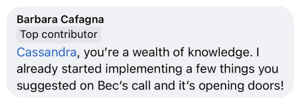 Cassandra just cuts the fluff and tells you exactly what you need to do. I've already implemented so many of her tips. Not only has it been easy, but the leads and connections I have been receiving are so aligned and high quality!!